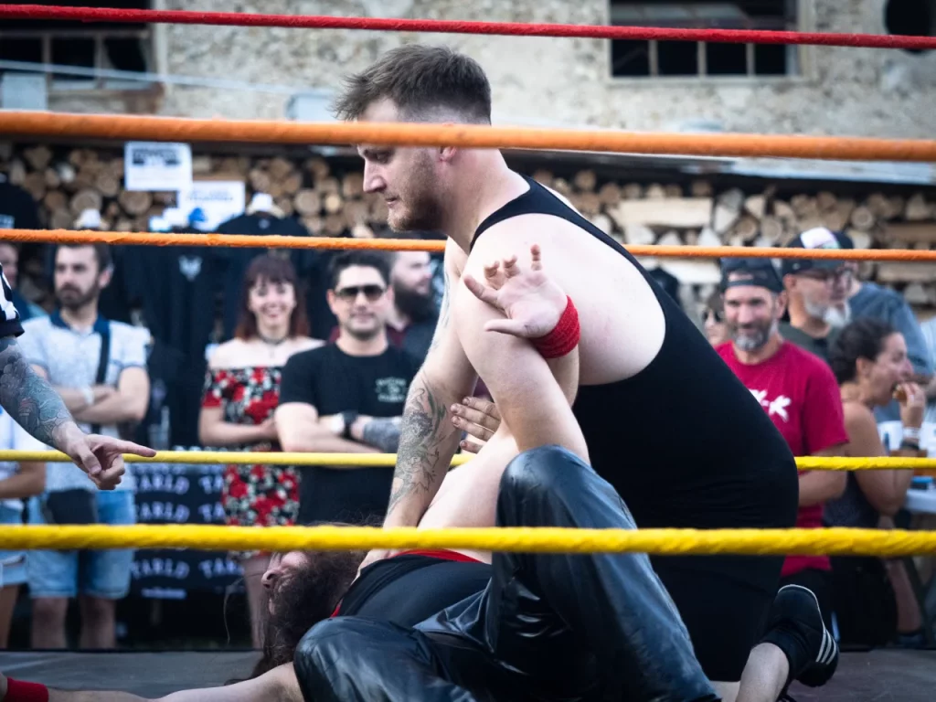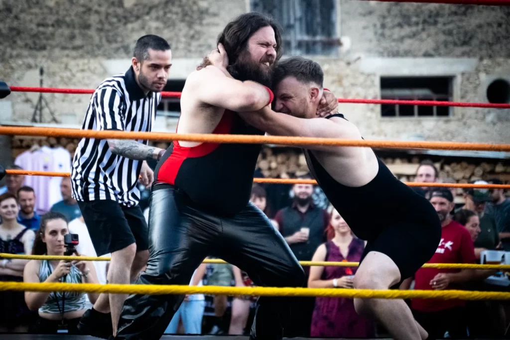 Après l’entrée, nous avons à droite le Merch, à gauche des exposants puis le bar situé juste en dessous de la scène. En effet, la particularité du lieu est que la scène est en hauteur, littéralement à ce qui pourrait être considéré au premier étage, et la fosse en bas, sur le côté du corps de ferme en U. En face de l’entrée, nous avons la surprise du soir : un ring de catch et plus au fond de la cour carrée la « cuisine » pour les burgers et frites.