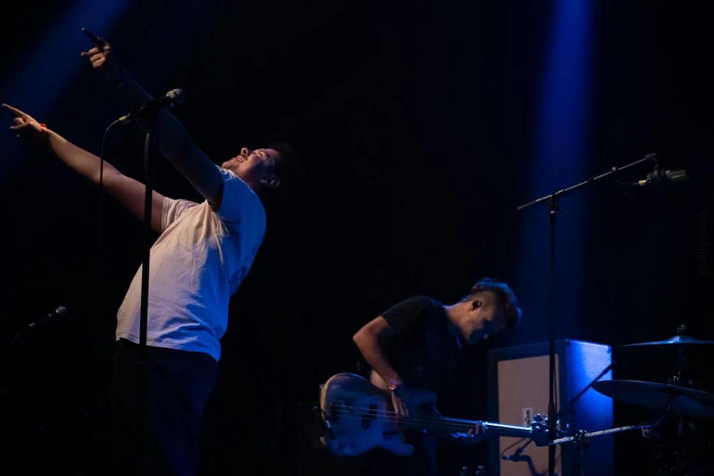21 h 10 : On nous emmène sur l’île du Diable (sur le titre Devil’s Island tiré de l’EP Let Me Jump) et, à 21 h13, c’est le premier slam lancé par l’amie Delphine (que nous saluons) et gros mosh dans la fosse.